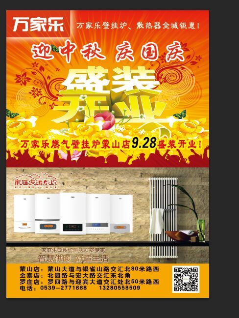 万家乐壁挂炉蒙山店9.28开业活动活动时间:2015.09.25——10.10 活动地址:蒙山大道与银雀山路交汇北80 米路西